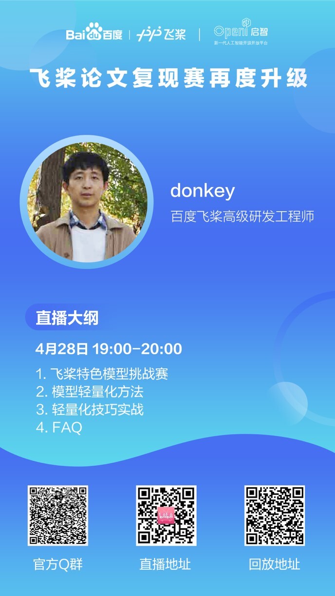 今晚,百度飞桨与 将联合主办第六期论文复现赛第三场重磅直播,由百度飞桨高级研发工程师donkey介绍飞桨特色模型挑战赛、讲解模型轻量化方法、揭秘轻量化技巧实战。干货满满,不容错过!
