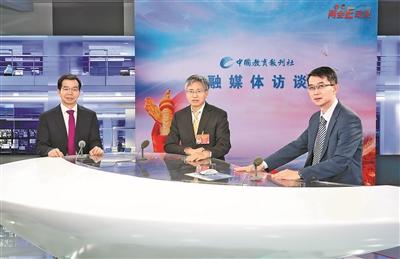 3月8日,尧德中(中)、黄荣怀(左)做客中国教育报刊社“两会E政录”演播室,就“利用智能技术改变人才培养模式和教学方式”的话题接受中国教育报记者(右)的专访。