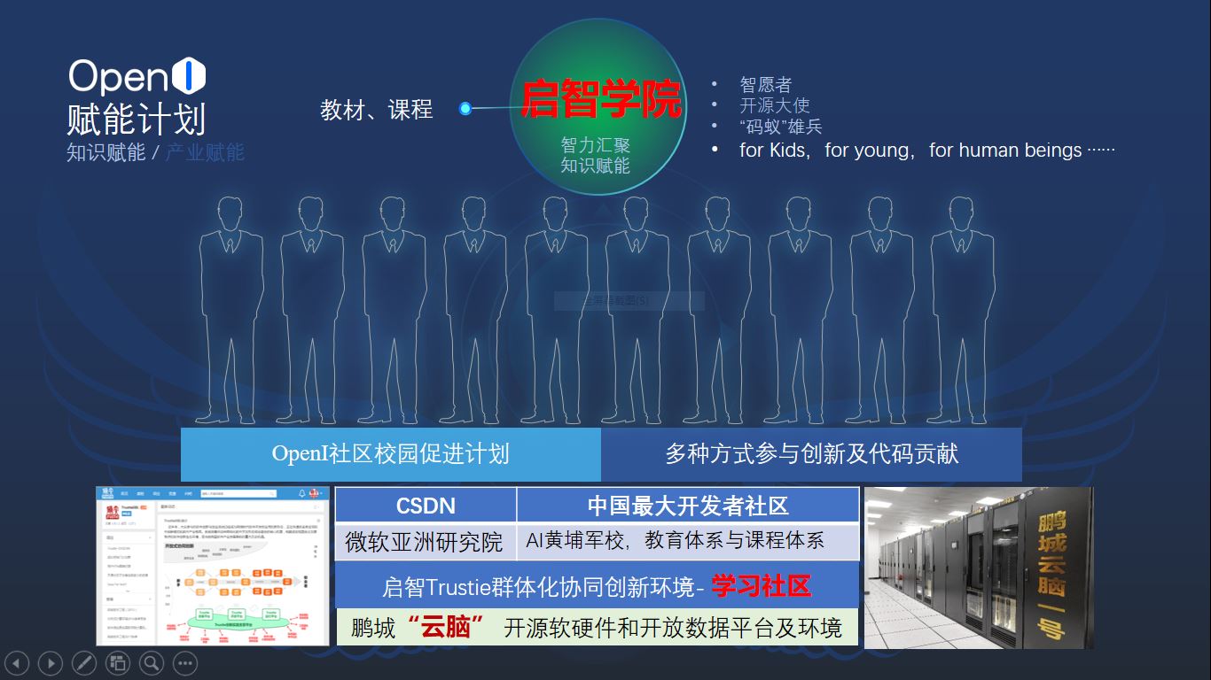 同时,OpenI加强"一体两翼"部署的“开源治理工作组”和“智能教育推进组”工作,加速共建OpenI开放数据社区、“启智”学习社区和开发者社区。