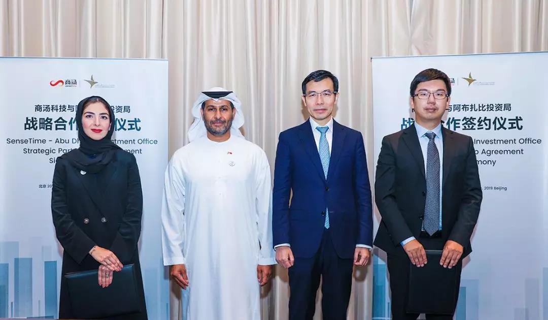 阿布扎比投资办公室首席执行官Elham M. Al Qasim(左一)、阿布扎比经济发展局主席赛义夫·穆罕默德·哈吉里(左二)与商汤科技创始人汤晓鸥教授(右二)、商汤科技联合创始人、首席执行官徐立(右一)在签约仪式后合影