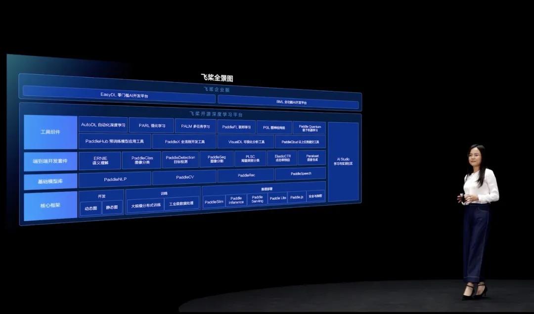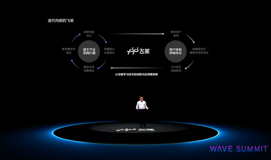 百度集团副总裁、深度学习技术及应用国家工程实验室副主任吴甜以“荡起飞桨 AI生产正当时”为主题做了演讲。她介绍到,飞桨深度学习平台作为百度“AI大生产平台”的基础底座,以大规模分布式训练、全硬件平台支持、端到端全流程工具以及飞桨Master模式,助力企业和开发者加速AI生产。无需从头学习难度高、迭代快的前沿科技,避免重复“造轮子”,应用AI的门槛更低、成本更低、效率更高。