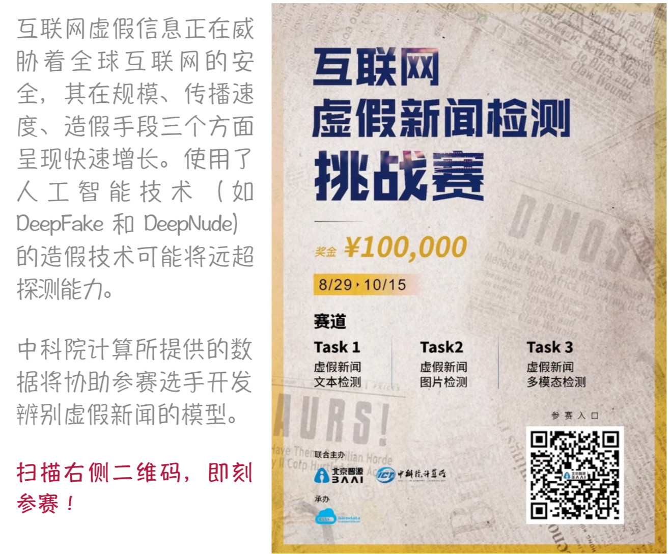 Task 3:虚假新闻多模态检测:随着多媒体技术的发展,新闻当中通常都包含着文本与图片等多模态信息,不同模态之间既存在着增强关系,同时也包含着互补信息。如何充分利用多模态信息进行虚假新闻检测仍是一项具有挑战的工作,为此,我们设立虚假新闻多模态检测子任务以促进该领域研究。具体任务为:给定一条新闻的多模态内容,包括文本、配图、用户特征等,要求参赛者判断该新闻属于虚假新闻还是真实新闻。
