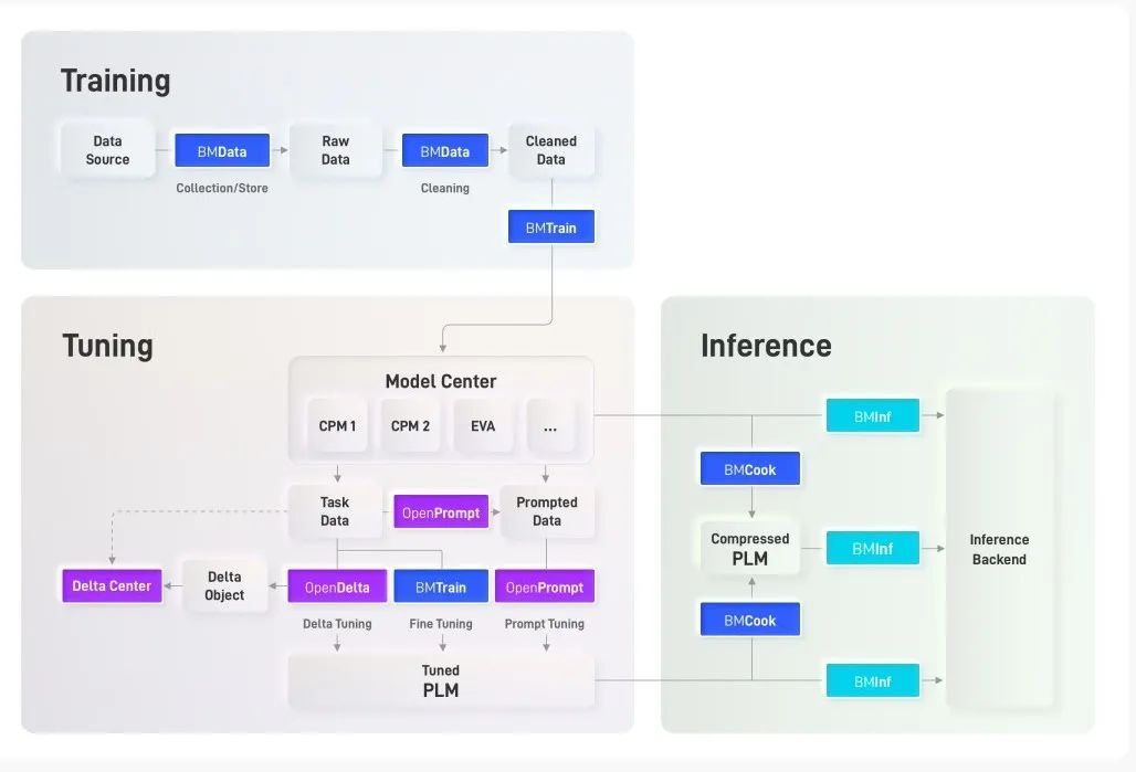 大模型相关工具在OpenBMB能力体系中发挥着核心作用。OpenBMB将努力建设大模型开源社区,团结广大开发者不断完善大模型从训练、微调、推理到应用的全流程配套工具。基于发起人团队前期工作,OpenBMB设计了大模型全流程研发框架,并初步开发了相关工具,这些工具各司其职、相互协作,共同实现大模型从训练、微调到推理的全流程高效计算。