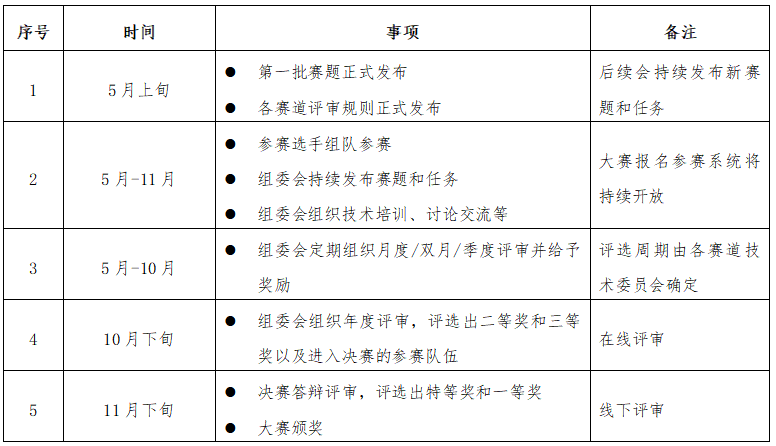 大赛采用全年开放、定期评比奖励、年度决赛颁奖的模式来组织,大赛年度主要时间节点安排如下,具体时间可以参考大赛官方平台: