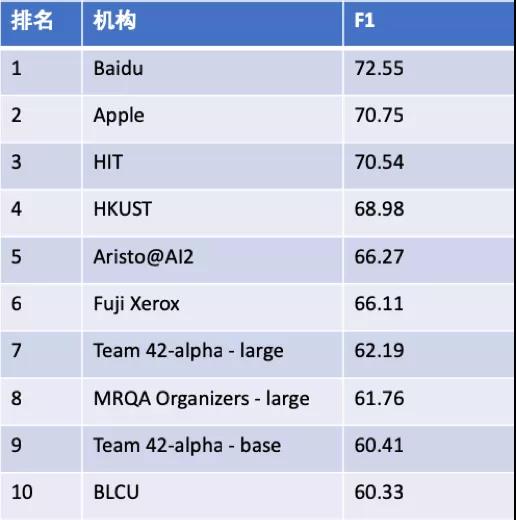 ▲MRQA 2019阅读理解国际评测最终榜单百度排名第一