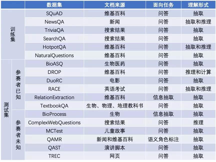 更重要的是,本次评测要求参赛队伍仅可使用6个数据集训练一个统一的阅读理解模型,之后在其它12个分布各异的数据集上测试模型效果。更困难的是,测试阶段中有6个在训练阶段完全没见过的未知来源数据集。数据集分布的巨大差异和测试数据来源的完全未知为参评系统带来了极大的挑战。这样的评测设置重点考察了阅读理解模型的泛化能力。