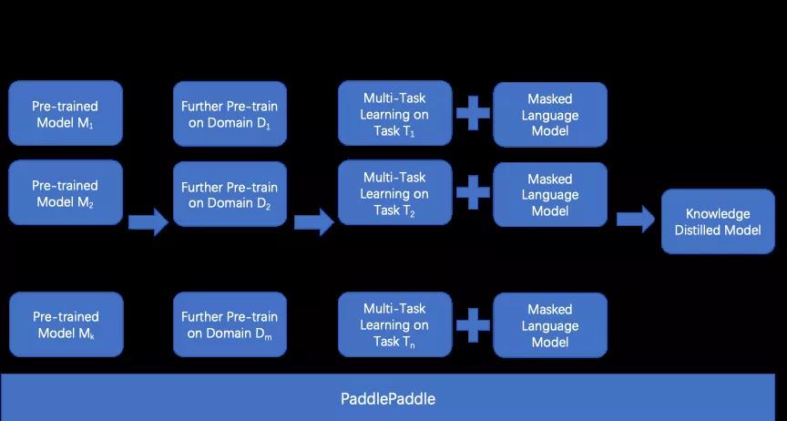 开发多任务学习最大的痛点就是要灵活地调度参数和任务。为此,飞桨开发了一套针对多任务学习场景的高级库 PALM( PAddLe Multi-task ,预计在 Paddle Fluid 1.6版本中开源,敬请期待),让用户只需要开发几十行代码,就可以轻松完成不同模型间参数和任务的调度。