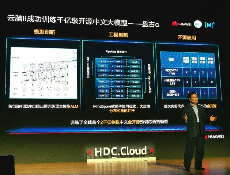 2021年4月26日,在深圳召开的HDC全球开发者大会上,鹏城实验室鹏城云脑技术总师、北京大学田永鸿教授发布了业界首个全开源2000亿参数中文预训练语言模型“盘古α”。这是国产全栈式AI基础设施支持2000亿级超大规模语言模型训练的第1次,探索并验证了国产E级智算平台在软硬件协同优化、大规模分布式并行训练等核心关键技术的可行性。代码、模型、评测数据集全部同步在OpenI 全面开源开放,训练语料和在线服务体验将在测试评估优化后开源开放。