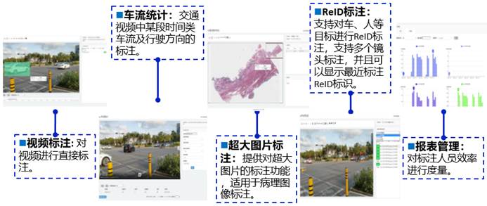 PLabel系统集成了大量数据标注相关功能,包括数据管理、自动标注、人工标注、ReID标注、车流统计、视频标注、医疗CT标注、超大图像标注等。目前还集成视频抽帧、目标检测、视频跟踪、ReID分类、人脸检测等系列算法,支持用户自行增加目标检测算法,实现对图像、视频的自动标注,并可以对自动算法的结果进行人工标注修订,标注结果支持COCO及VOC格式。