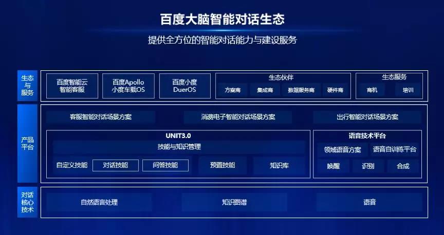 在智能对话领域,百度是走在前沿的创新者。基于百度多年积累的自然语言处理、知识图谱和语音等对话相关的 AI 技术,百度已形成包含 UNIT3.0 和语音技术平台的百度大脑智能对话引擎,并在此基础上推出客服、消费电子和出行三大智能对话场景方案。