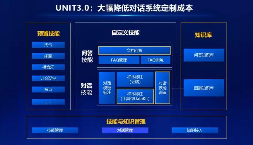 UNIT3.0 也进一步升级了技能与知识管理能力,帮助开发者整合对话、问答技能,接入知识,通过单一接口一站式满足复杂的对话系统研发。技能管理实现多技能顺序可调,并共享全局记忆;对话管理具有在线与离线可编程对话管理框架,可适应多样化的业务场景;知识接入方面具备图谱知识库、关系数据库,HTTP 服务全面支持接入。