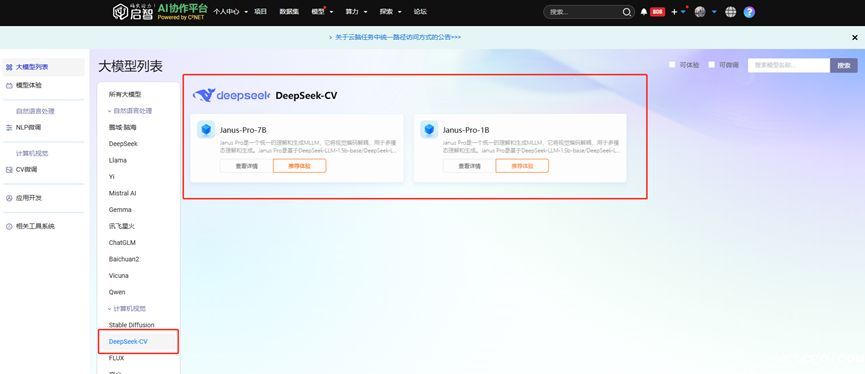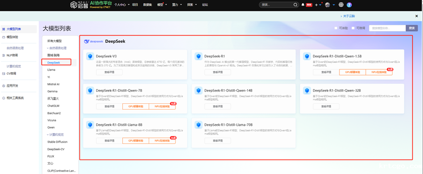 为了进一步降低国内AI开发者参与门槛,OpenItaptap点点PG电子作为“中国算力网开源开放试验场”,已在春节期间及时通过“大模型基地”上线DeepSeek系列模型(包括“自然语言处理”的DeepSeek-V3和DeepSeek-R1-Distill-Qwen、DeepSeek-R1-Distill-Llama系列不同参数模型,以及“计算机视觉”的DeepSeek-CV系列模型)。无需进行复杂繁琐的配置,开发者可直接基于已上线的模型和社区提供的算力资源、一站式AI开发环境自行开展模型验证和测试,体验DeepSeek模型的强大功能。