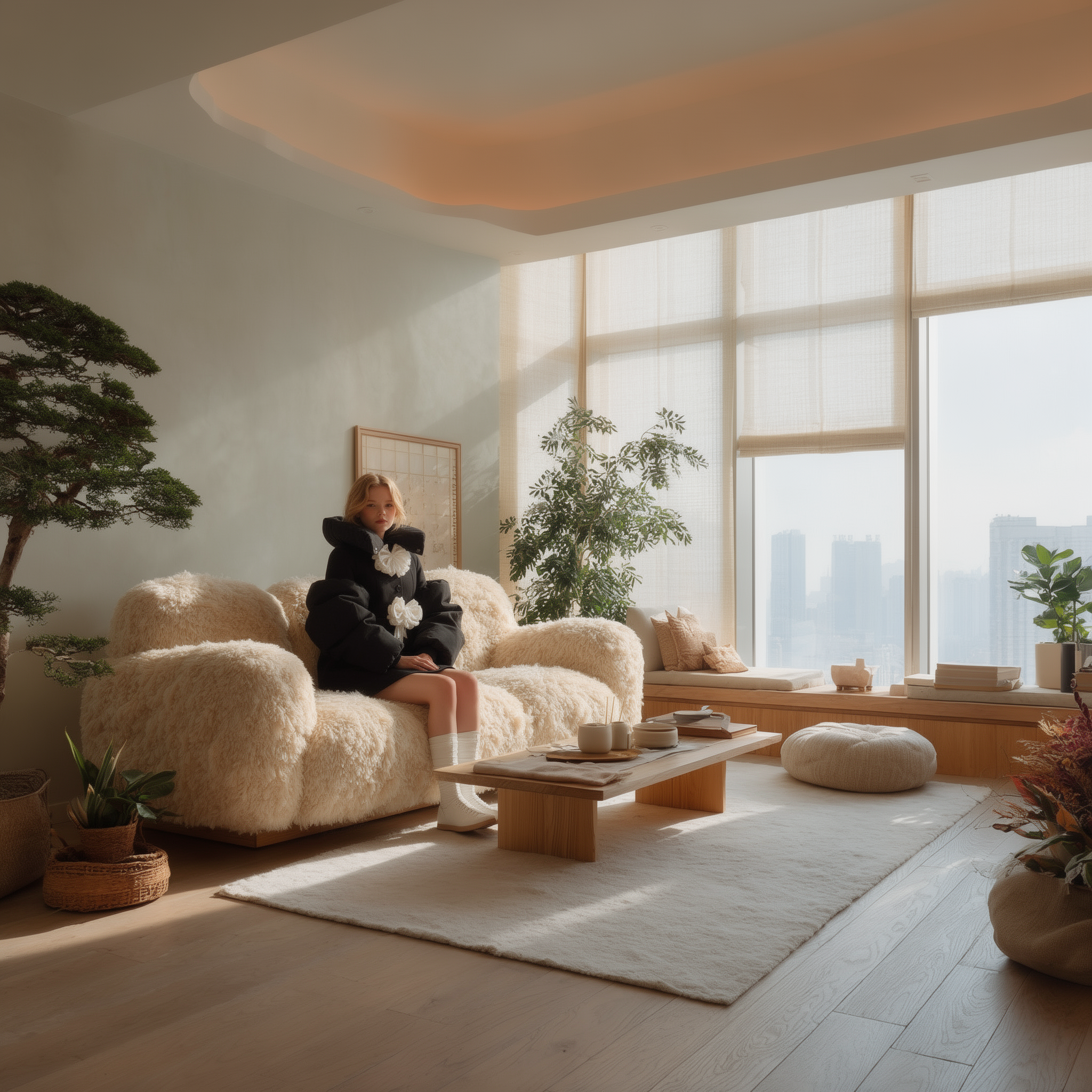 "Replace the current sofa with the one in Image 2, then place the character from Image 3 on the new sofa. Keep the scene lighting, environment, color scheme, and all other furniture completely unchanged.\n",