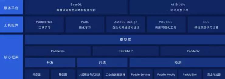 在工具组件上,PaddlePaddle 提供包括迁移学习、强化学习、自动化网络结构设计、训练可视化工具、弹性深度学习计算等在内的多个工具组件,适应工业大生产的需要。而在服务平台层面,PaddlePaddle 则提供零基础定制化训练和服务平台 EasyDL 以及一站式开发平台 AI Studio。他表示,这一整套的框架和服务,可以帮助广大开发者和企业利用工具化、平台化的方式,进一步降低深度学习应用门槛,加速推动产业智能化变革。